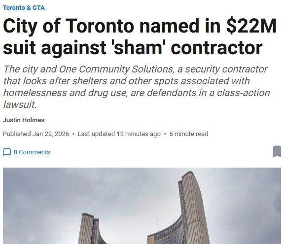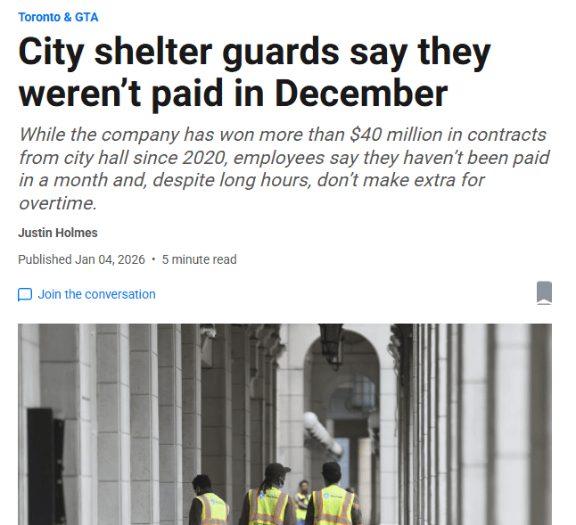 For five years, employees of One Community Solutions (OCS) have provided security services at encampments, homeless shelters, safe injection sites, and city buildings in Toronto. Toronto City Hall has provided over $40,000,000 in contracts to OCS, largely to pay these employees.
